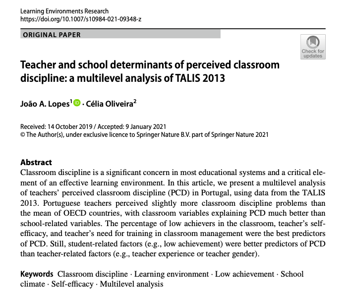 O Prof. Dr. João Lopes e a Prof.ª Dr.ª Célia Oliveira, publicaram o artigo: "Teacher and school determinants of perceived classroom discipline: a multilevel analysis of TALIS 2013", na Revista Learning Environments Research.